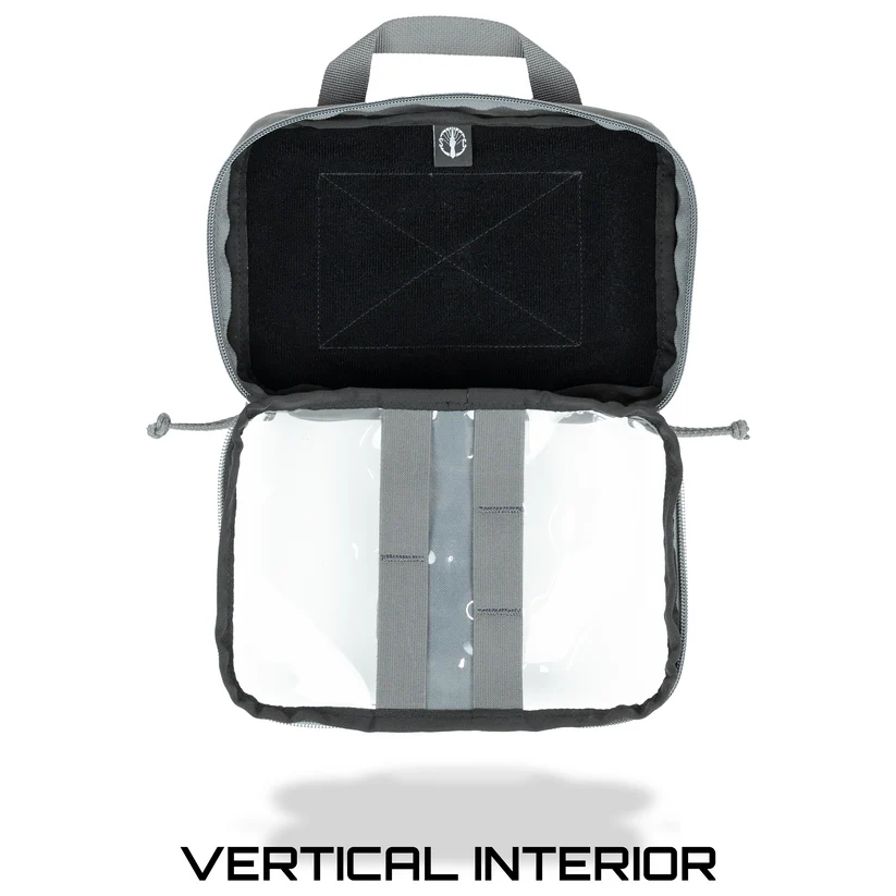When we started designing the Medicus we asked end users if they wanted a window to look into the contents or more organization on the opening side. People came back 50/50 so we did BOTH. The front face features a vinyl window with a Velcro® patch field running Horizontally or Vertically and behind it is two bands of elastic organizational cells. This allows both visual access for when multiple medics are using a pack that isn't their own in mass casualty events AND still allows for more organization within the pouch.