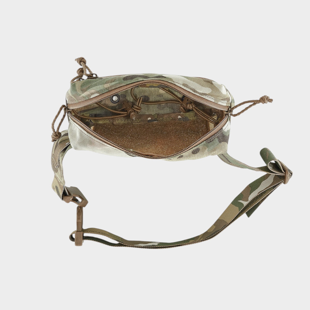 The inside features soft loop fields on both sides. This makes the pouch very dynamic, giving you the ability to use our Pouch Insert Suite to fit your requirements. It also features two slide-locks that make it easy to adjust the tension of the elastic loops hanging below, as well as two internal tie-down loops for securing sensitive equipment. The two grommet holes on the bottom aid with drainage of the pouch, if submersion occurs.