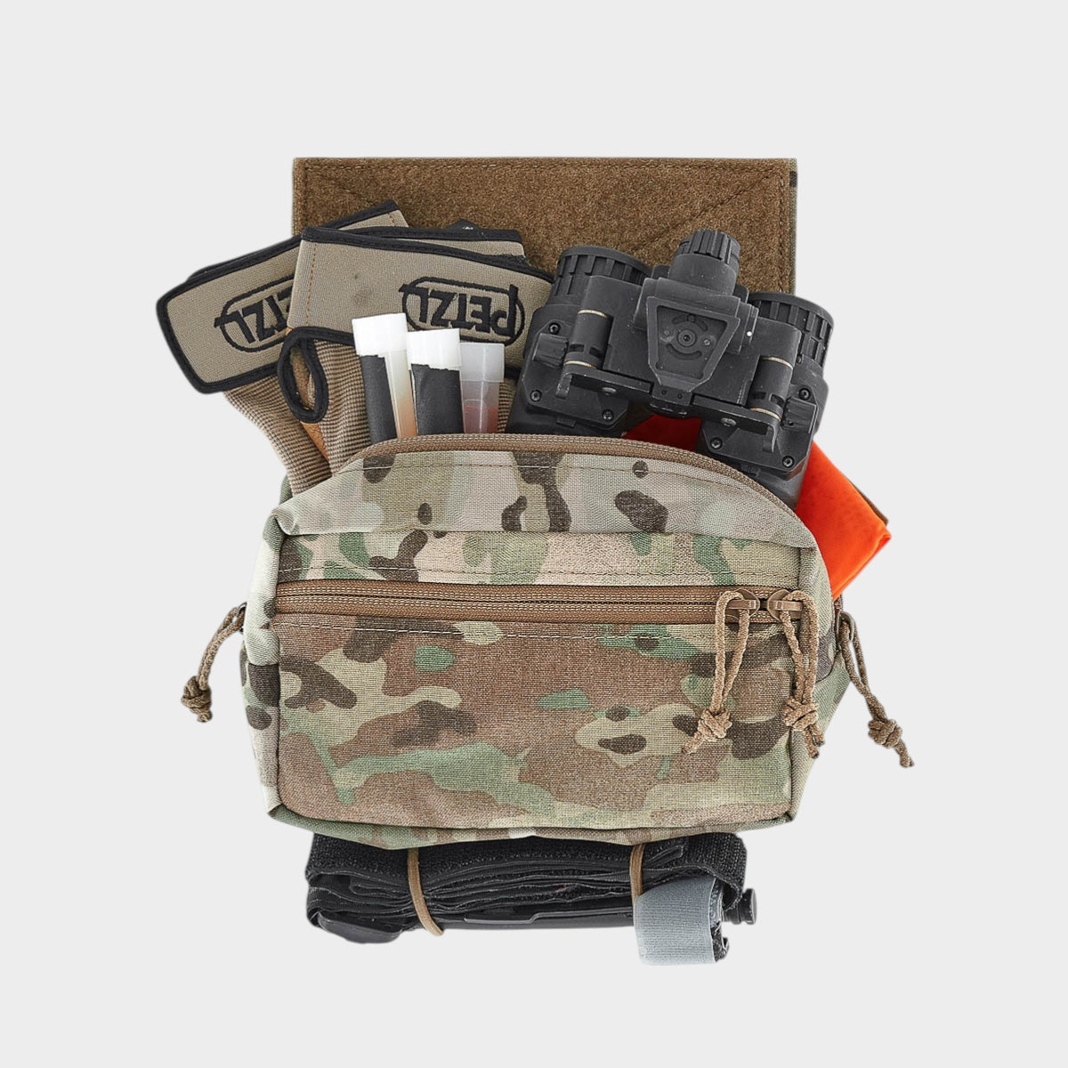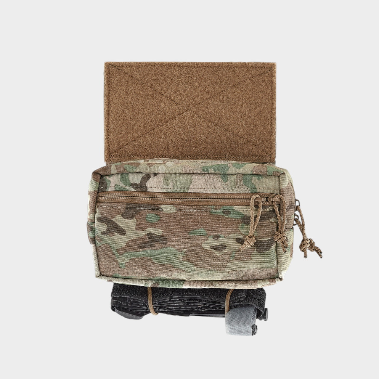 The front of the pouch features a small zippered stash pocket that is perfect for easy access to small items. The bottom of the pouch features two elastic loops that can be adjusted to hold a Tourniquet or other equipment that you may need to rapidly deploy. If bottom carry doesn't fit your mission needs, you can easily remove and reinstall the loops as necessary.