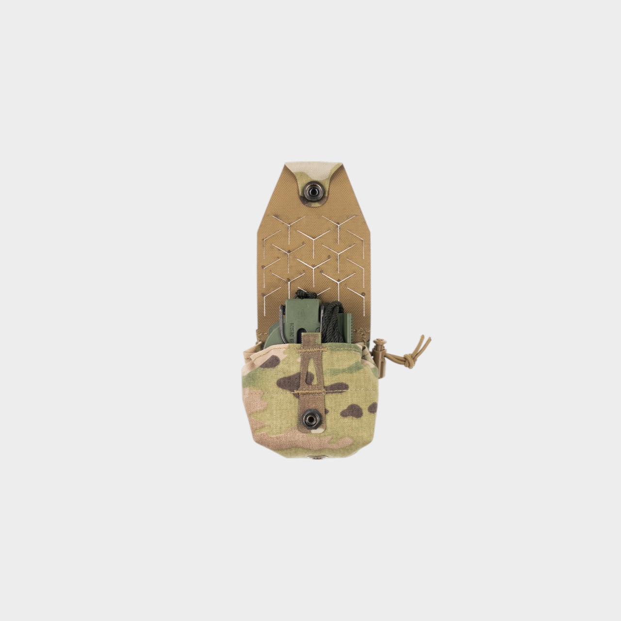 - The flap of the pouch features a scrim cover, when pulled tight, will wrap around any irregular shapes and keep the user’s kit fully locked into the pouch.