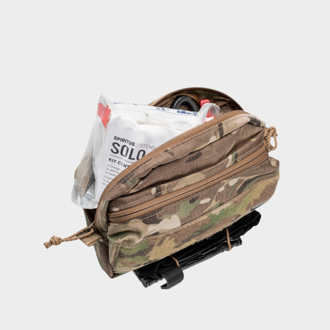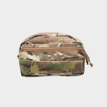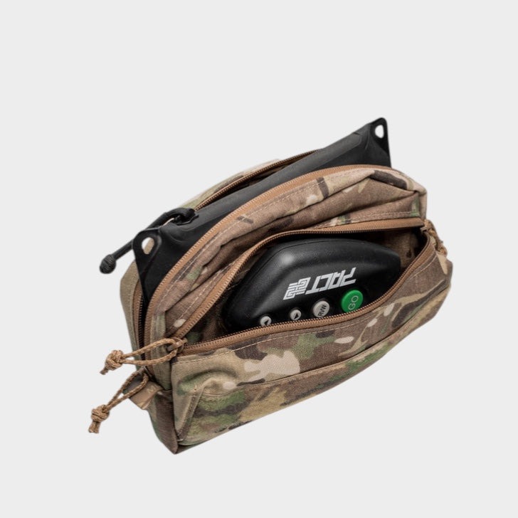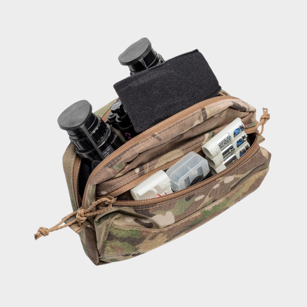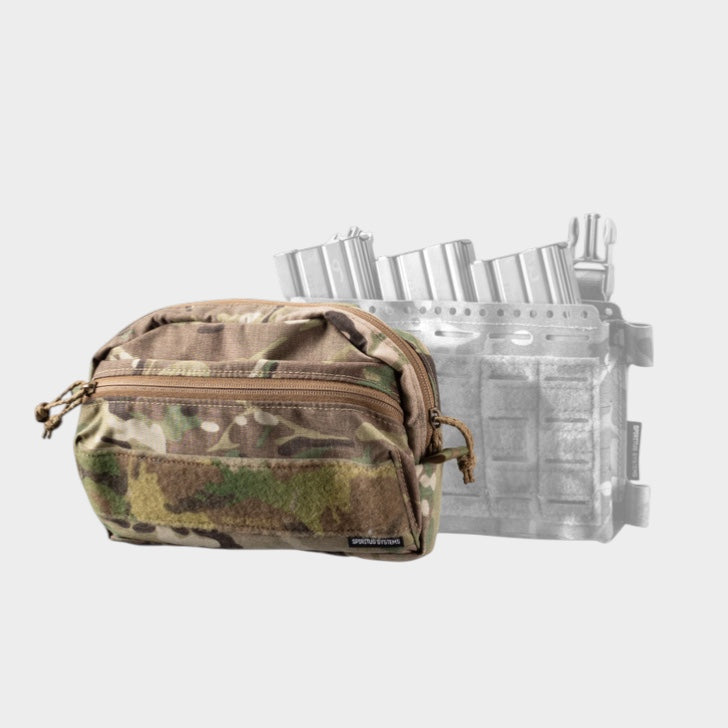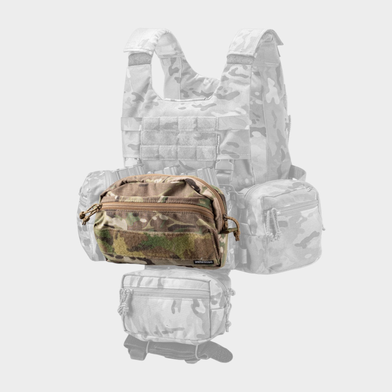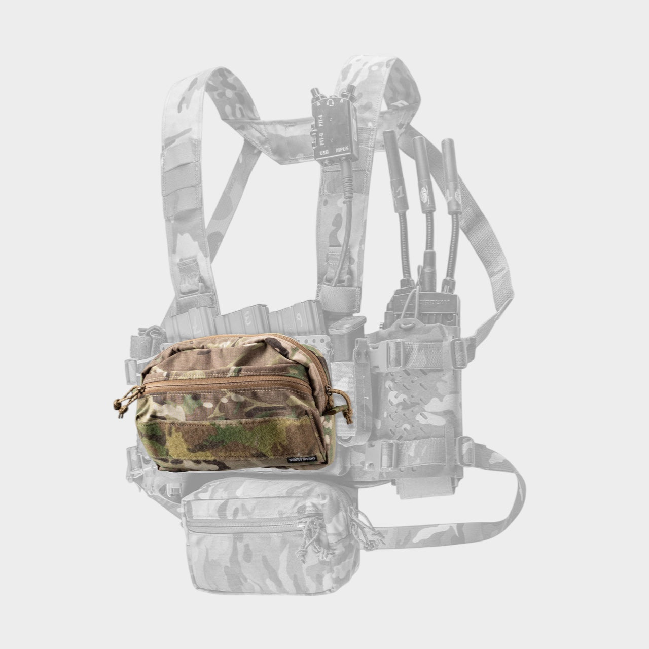The Spiritus Systems CCS Pouch is a purpose-build companion pouch for the MkV Chassis. It is designed to cover the entire front of the chassis to give the system a large volume of general-purpose storage. The Pouch is divided into two sections, with a strip of loop on the outside of the pouch for affixing identification and other Patches.